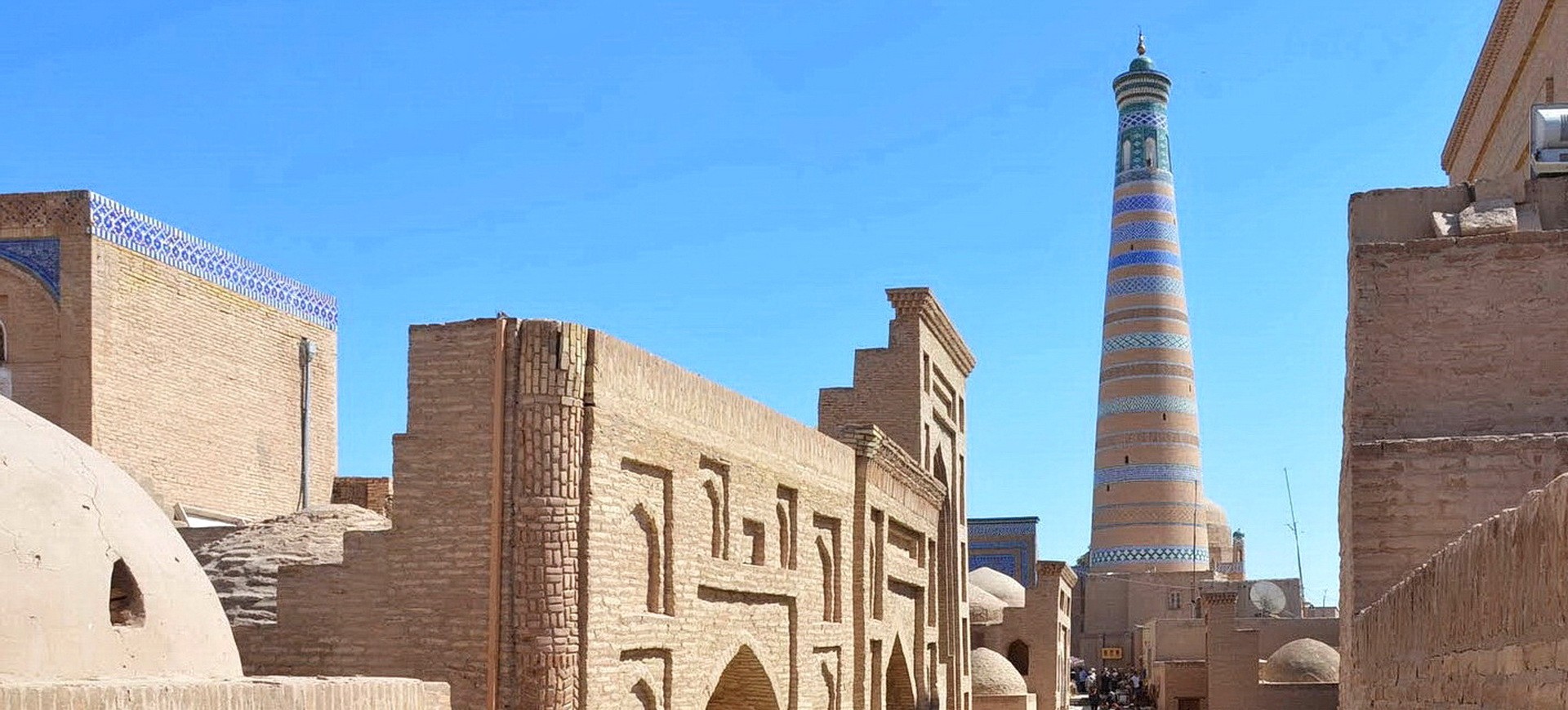 Vous découvrirez successivement la porte d’entrée de la vieille forteresse en pisé Ata Darvaza, le curieux minaret tronqué de Kalta Minor qui devait être le plus haut minaret de l’Orient musulman, la médersa Mohamed Amin Khan, le siège du roi et l’ancien palais de Koukhna Ark qui regroupe la mosquée Juma, la Salle du Trône et la Chancellerie, la médersa Mohamed Rakhim Khan, le palais de Tach Khaouli, le Harem de Khan avec sa cour intérieure tapissée de céramiques bleues, la médersa et le caravansérail d’Allakouli Khan, la Mosquée du Vendredi datant du XIème siècle avec ses 212 colonnes en bois sculpté aux motifs différents.